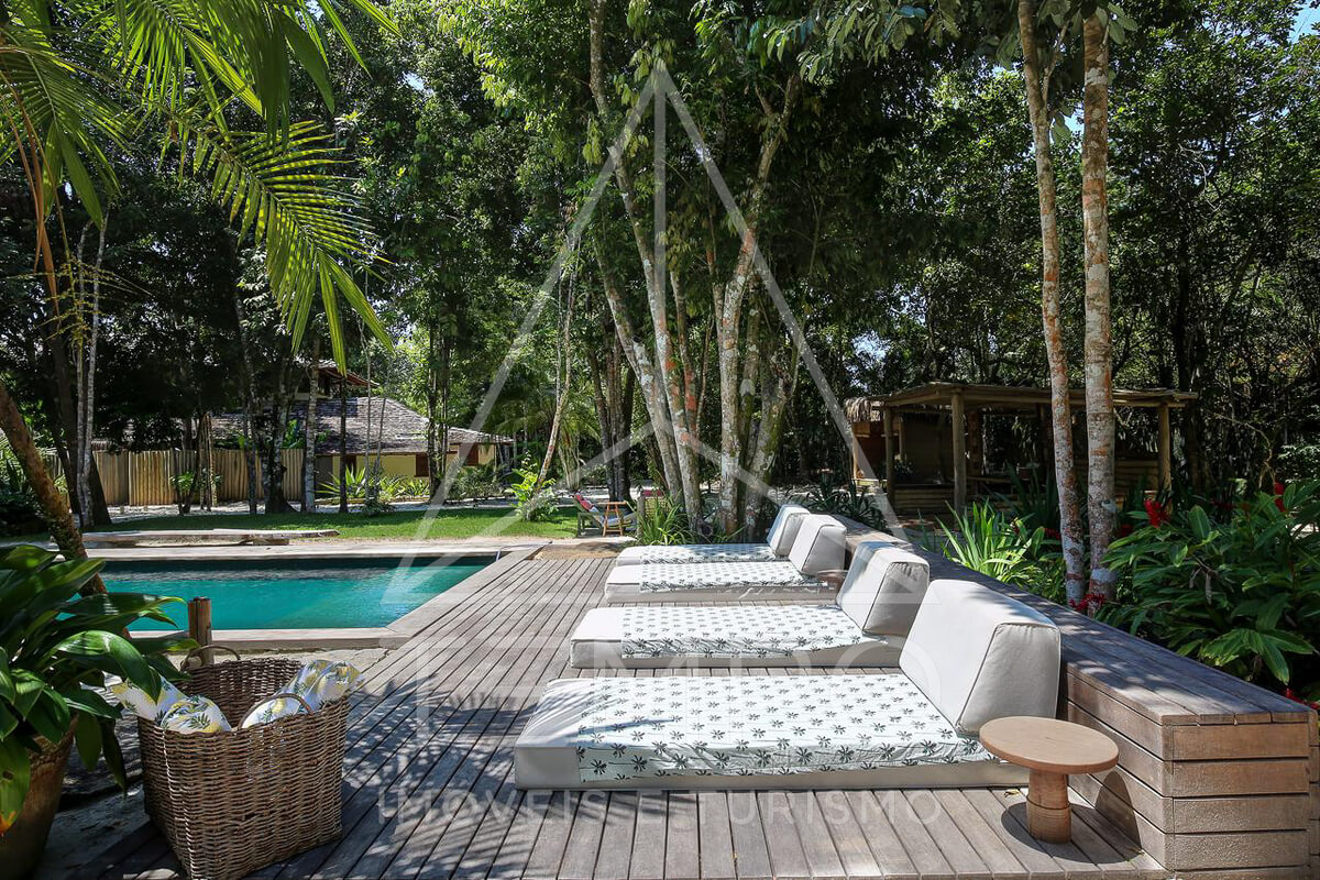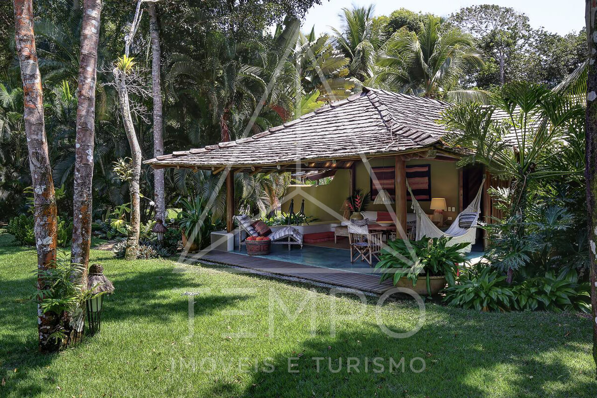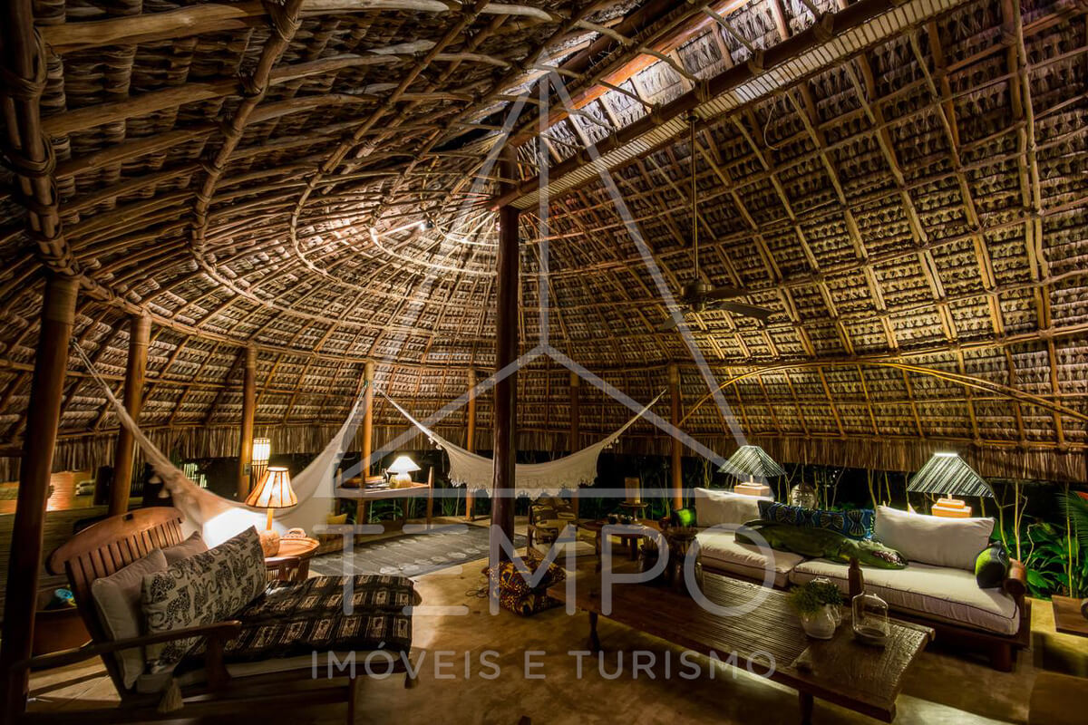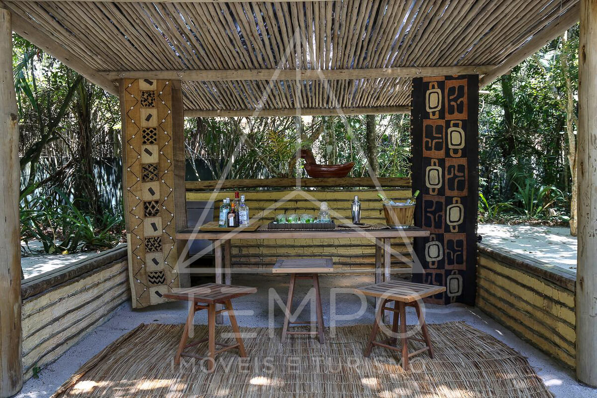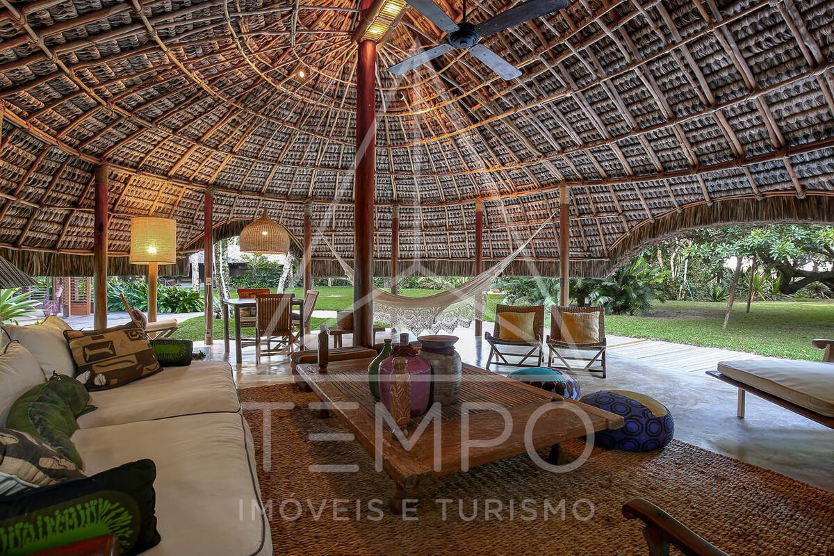 Com um design arquitetônico que valoriza a conexão com a natureza e a cultura local, a casa possui uma ampla área de lazer construída sob uma oca, promovendo interação com as tradições da região. Os espaços são amplos, com uma decoração rústica à baiana, divididos em quatro unidades que garantem tranquilidade e oportunidades de convívio familiar. Além disso, os hóspedes podem usufruir de um espaço destinado a atividades e massagens.