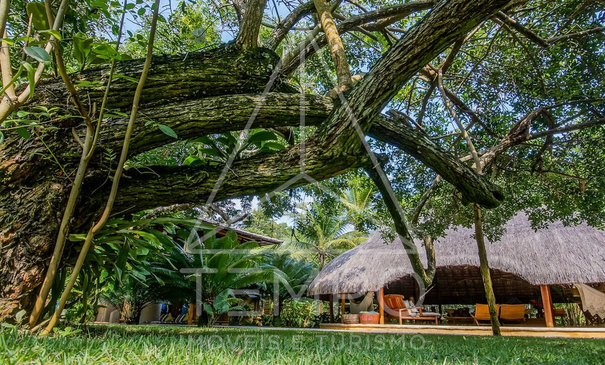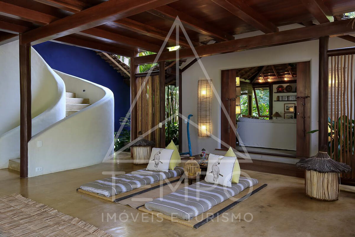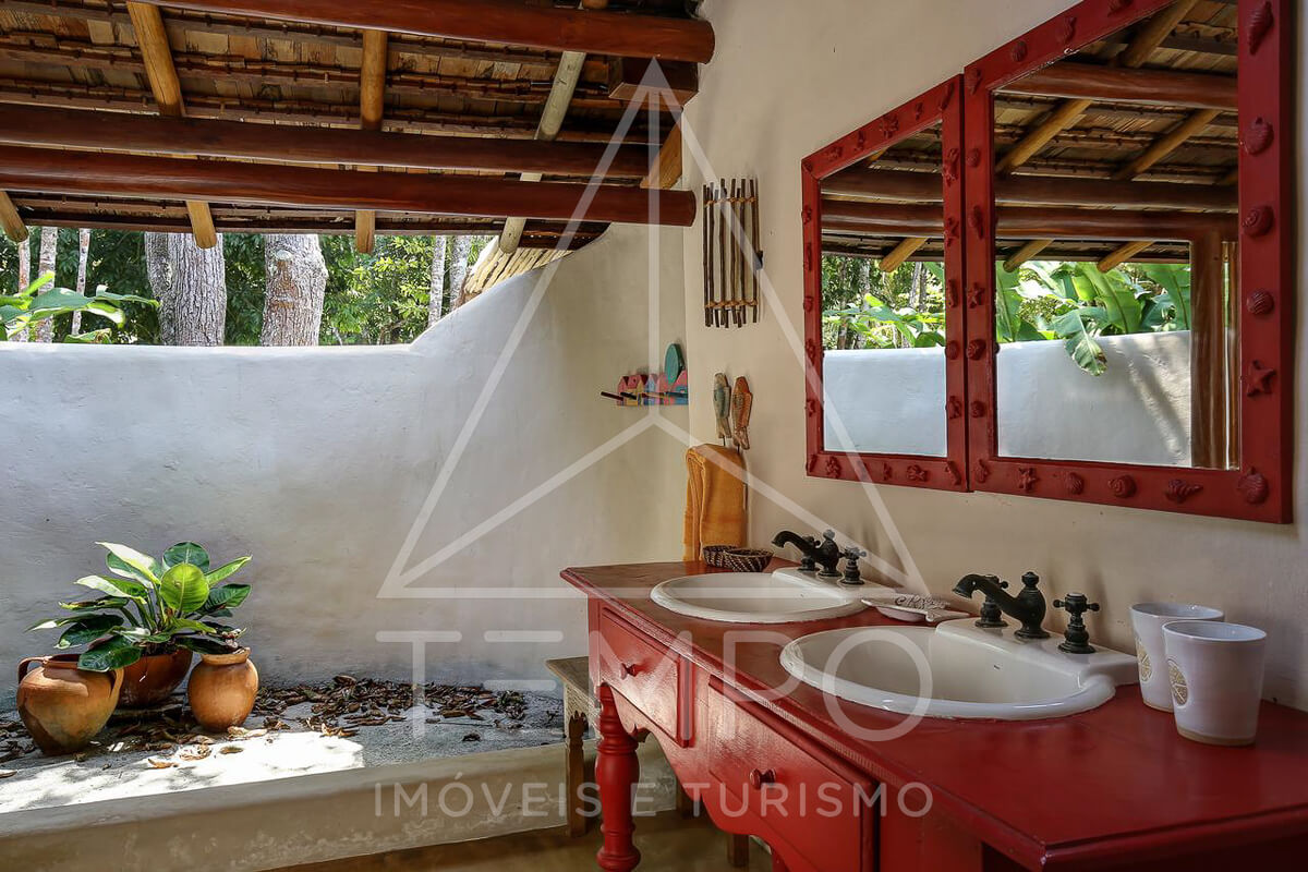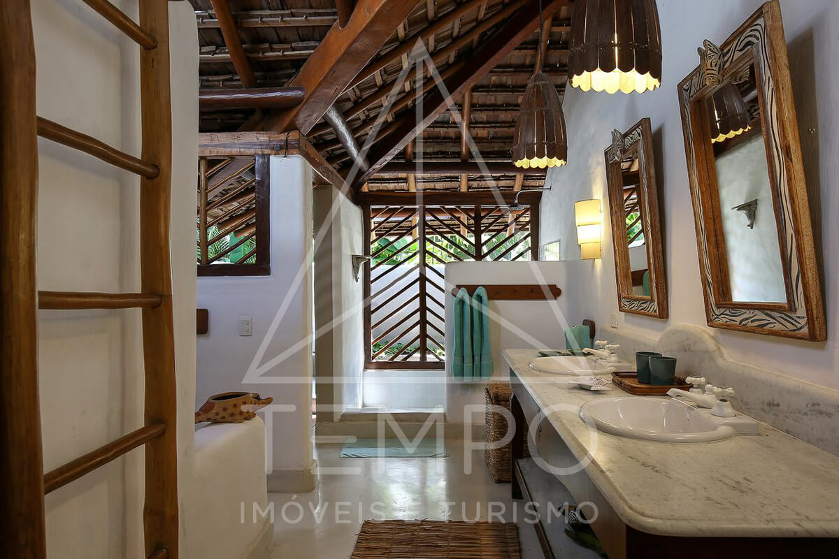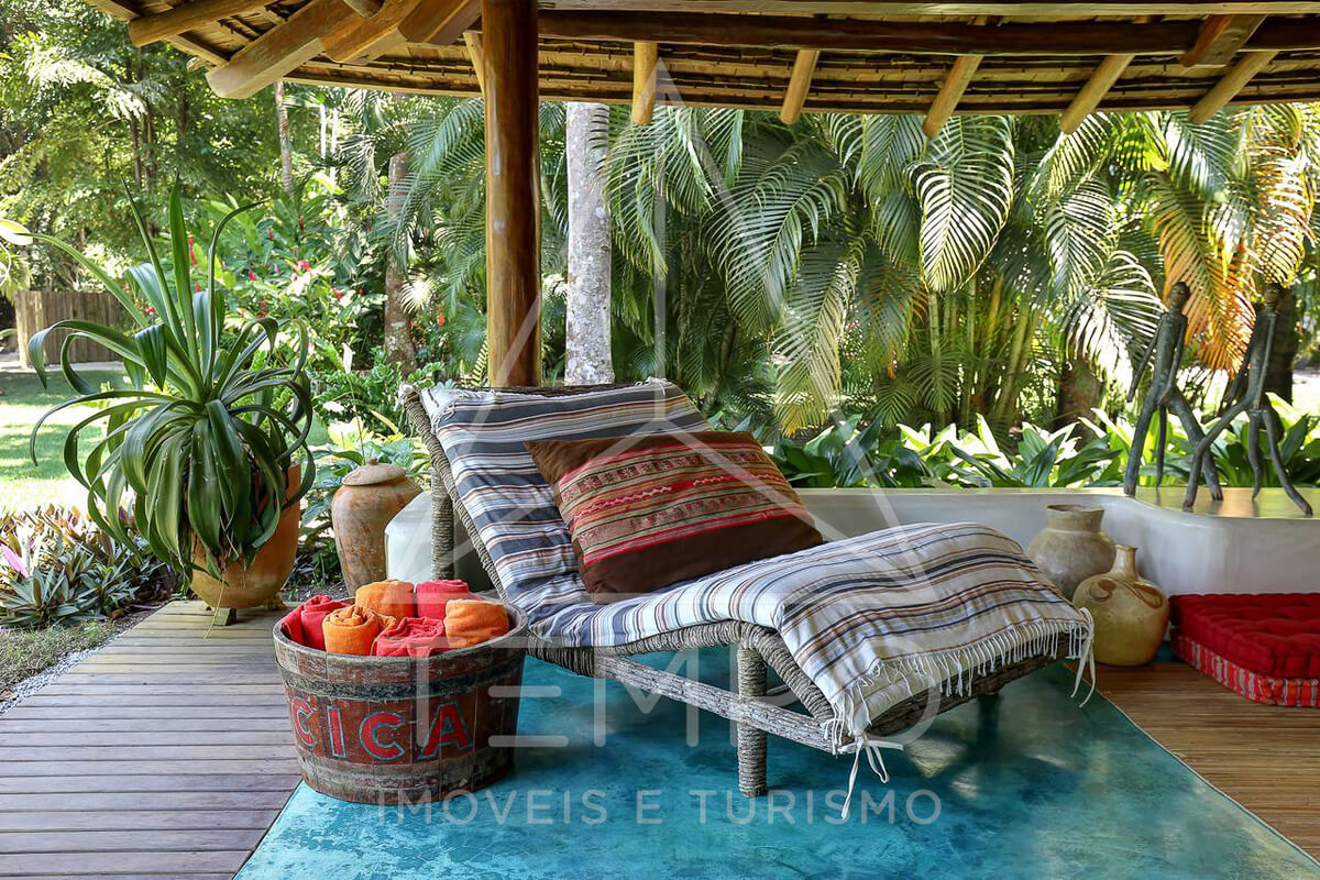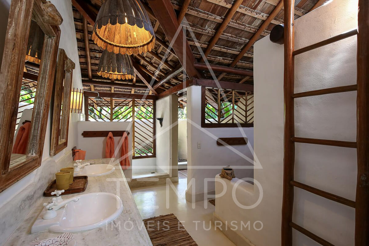 Com um design arquitetônico que valoriza a conexão com a natureza e a cultura local, a casa possui uma ampla área de lazer construída sob uma oca, promovendo interação com as tradições da região. Os espaços são amplos, com uma decoração rústica à baiana, divididos em quatro unidades que garantem tranquilidade e oportunidades de convívio familiar. Além disso, os hóspedes podem usufruir de um espaço destinado a atividades e massagens.